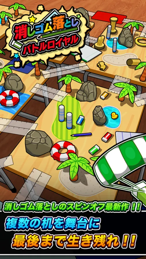 複数の机を組み合わせ、南国・遺跡・火山など様々な場所で最後まで生き残れ!!最後の一人を目指して、クラスみんなで消しゴムを落としあえ!