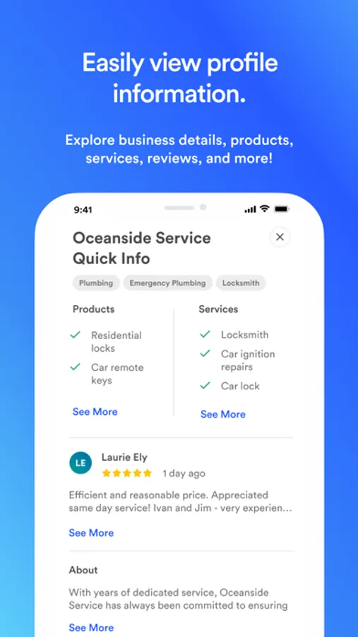 How does it work? First, use the search bar to find businesses near you or choose one of the local recommendations. Scroll through the results and compare price ranges, payment methods, trading hours, products, services, reviews and more. Then, you can contact the business directly through the app or add their contact details to your smartphone for later. It’s that easy!