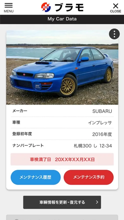 一度店舗へご来店いただきお車の登録がある場合、アプリに必要情報を入力していただくと、ご自身のお車の車検時期などがアプリ上でご確認いただけます!