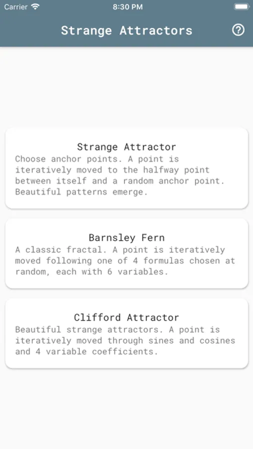This app shows off some of the beauty of mathematics. Fractals, strange attractors, and more!