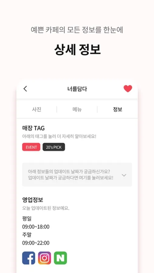 * 찜하기 : "살면서 이 카페에 한번은 꼭 가보겠다" 하시면 찜하기 버튼을 꾹 눌러주세요