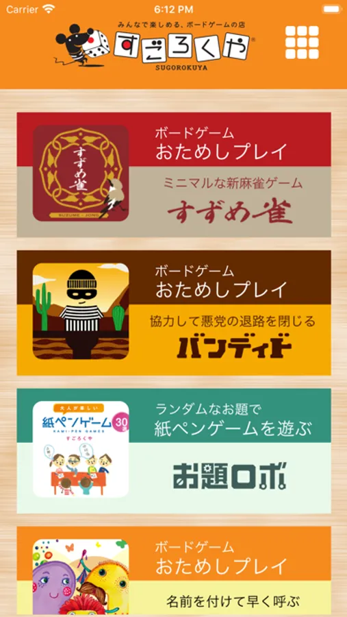 名作ボードゲームの面白さを、ごく短い動画と選択肢だけですぐに体験できる「おためしプレイ」や、ゲームの紹介動画、お店の案内、販売中のゲームの一覧、イベント情報など、ボードゲームの楽しさをご案内します。
