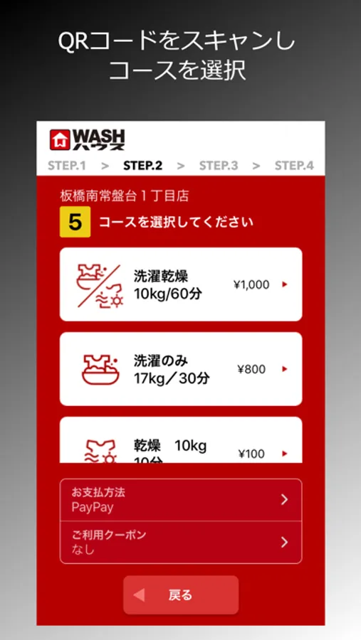 QRコードスキャンで利用したい機械を特定し、コースを選択してください。