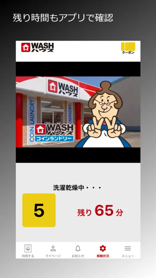残り時間の確認もWASHハウスアプリで確認できます。終了通知も届きます。