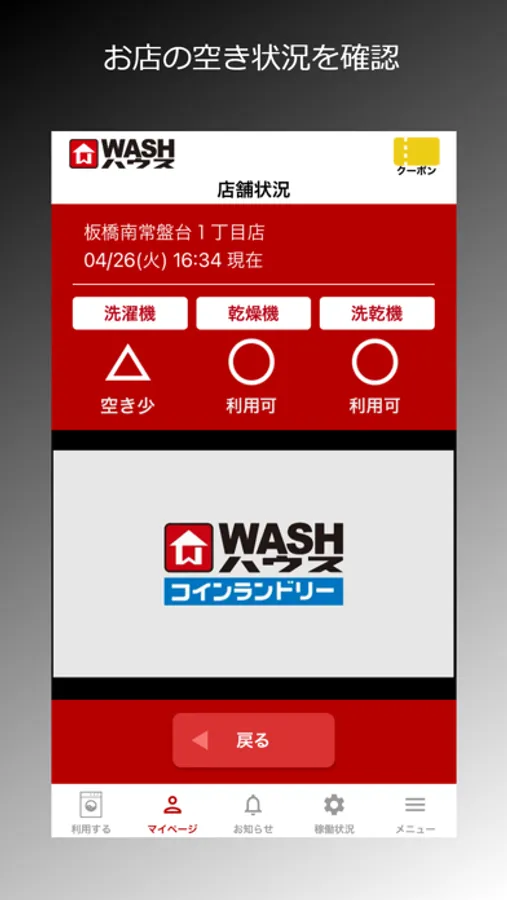 よく行くコインランドリー店舗のキャンペーン情報もアプリからチェック!時間帯割や曜日割を活用すれば更にお得にお洗濯ができます。