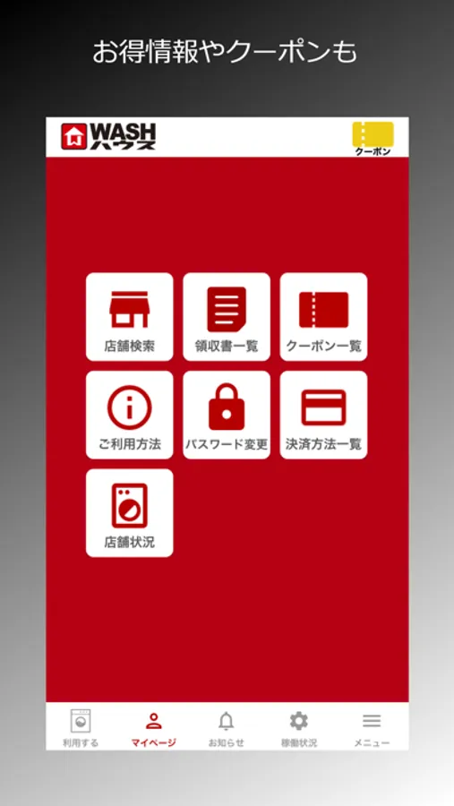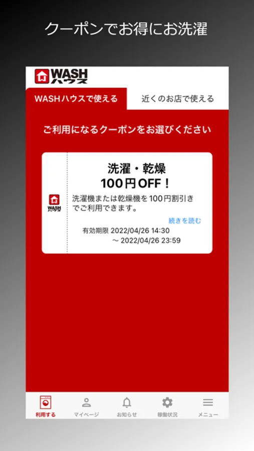 WASHハウスのコインランドリー店舗でお洗濯に使えるクーポンの他、店舗近隣のお店で使えるクーポンも配信。お洗濯を待っている間に、お近くのお店でもお得にお過ごしいただけます。