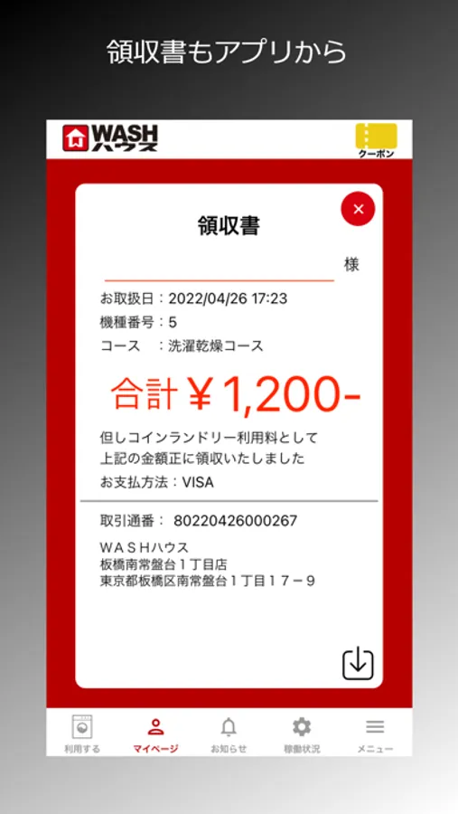 領収書が必要な時も、アプリで表示して簡単にダウンロードすることができます。