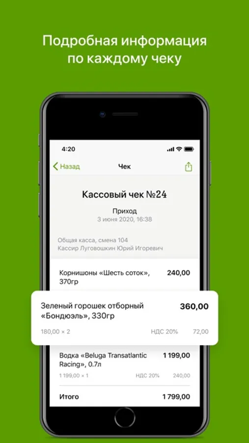 • просматривайте чеки на приход и возвратные чеки;