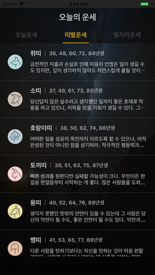 2. 오늘의 띠별 운세 : 우리에게 익숙한 12간지, 띠별 하루의 운을 총운별, 년생별 확인하실 수 있습니다.