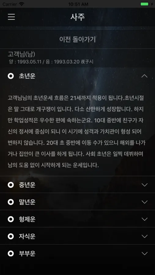 7. 10년 대운 : 10년 주기별 운세를 확인하실 수 있습니다.