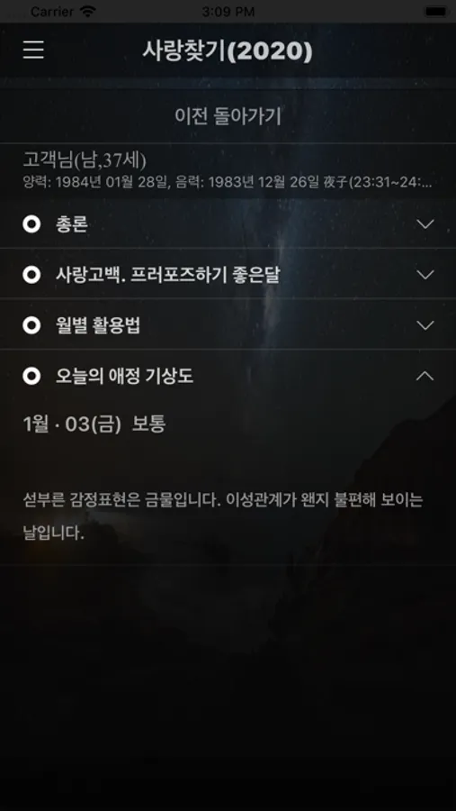 8. 사랑찾기(2019) : 운명의 사랑에 대한 총론과 월별 및 오늘의 애정 기상도를 확인하실 수 있습니다.