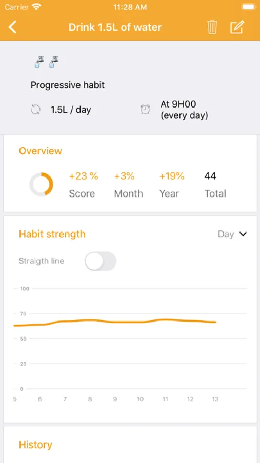 For every habit, you can access a statistics page containing essential data to help you understanding and improving it :