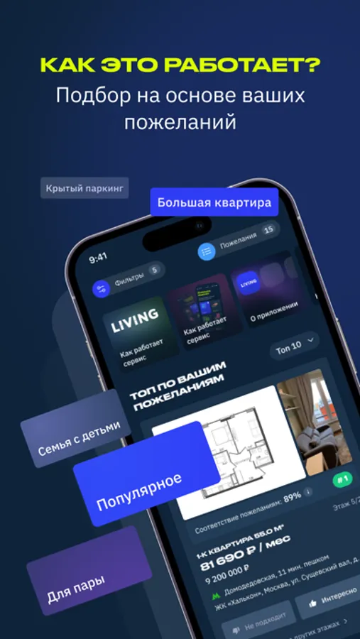 Цифровой риелтор Living найдет все квартиры по размеру комфортного ипотечного платежа, проанализирует ваши персональные пожелания и выведет самые подходящие варианты на первые места. Квартира мечты – в одном клике!