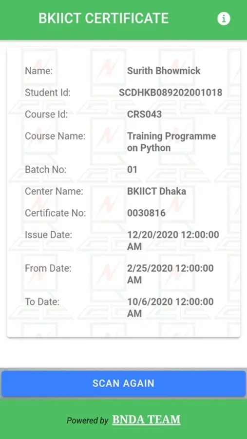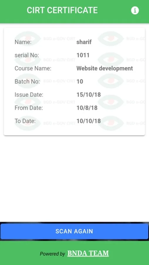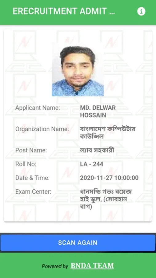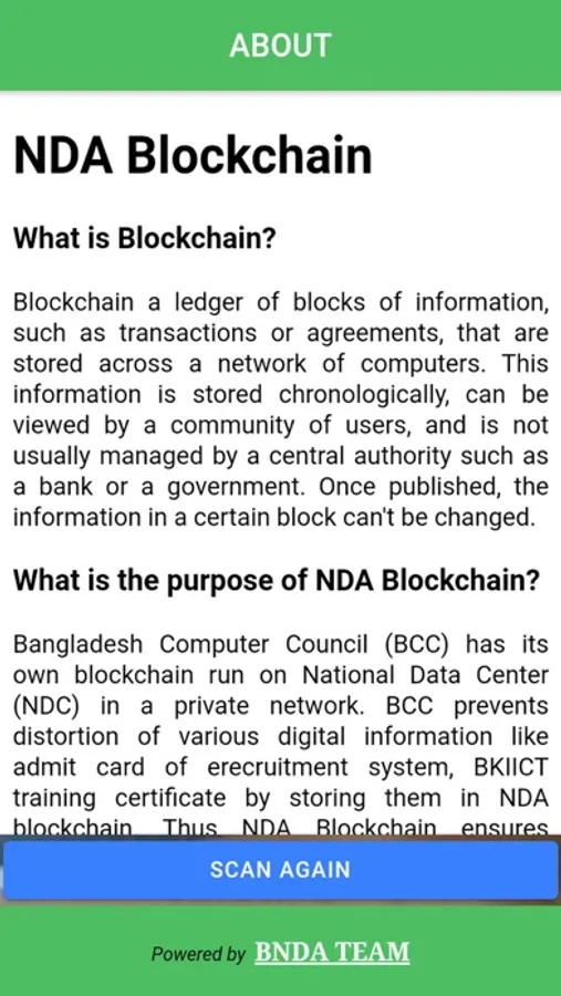 Bangladesh Computer Council (BCC) has its Blockchain Technology running on National Data Center (NDC) in a private network. BCC prevents distortion of various digital information like admit cards of eRecruitment system, BKIICT training certificates by storing those admit cards and certificates in BNDA Blockchain. One can easily verify his admit card issued by eRecruitment system, certificate from BKIICT by scanning the QR code on it.