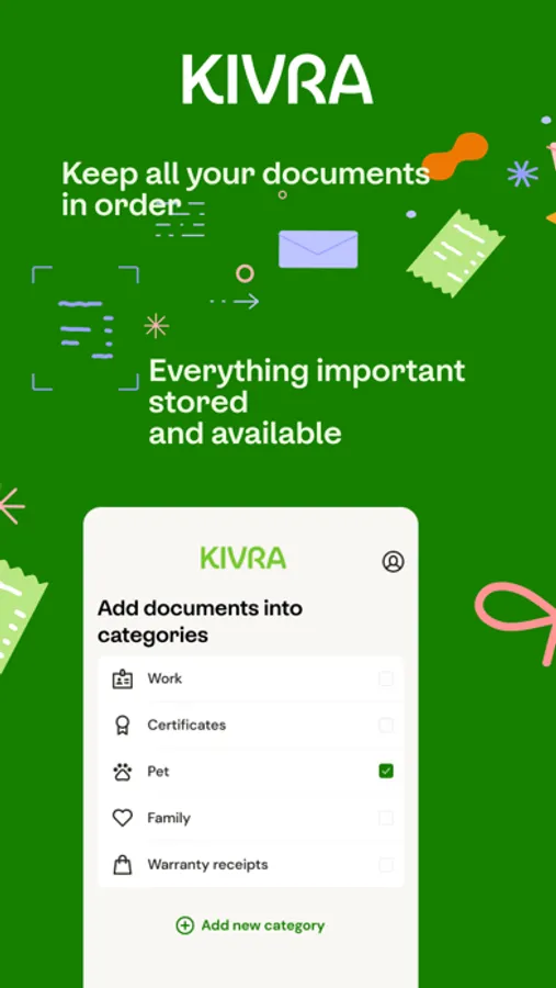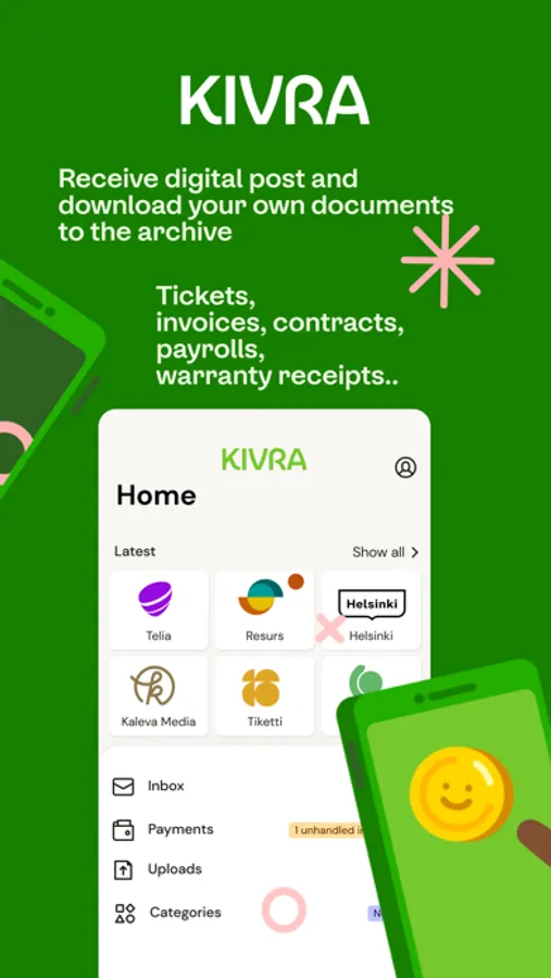 Kivra is a free of charge digital postal service, that gathers all your important documents in one secure and easy to use app. You can receive contracts, pay slips, event tickets, invoices and other digital mail to Kivra from over 40 000 companies and public organisations in Finland. On top of this, you can download your own documents to Kivra. Downloading and using Kivra is free of charge.