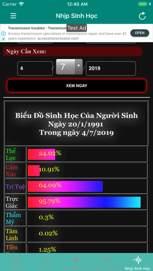 • Nhịp Sinh Học: Biểu đồ sinh học của bạn trong ngày - hay còn gọi là biorhythm. Thể hiện mức tăng giảm về lý trí, tình cảm, thẩm mỹ, tiền bạc, tâm linh của bạn hằng ngày
