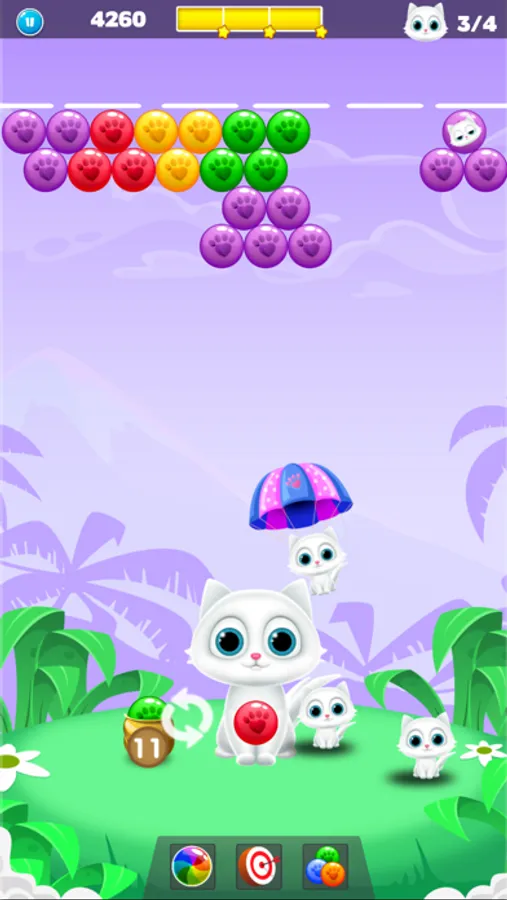 Pawpaw Bubble Shooter is a bubble shooter and balloon blasting game where you can blow bubbles with colorful balls, paw points, long shooter features, and help the mother cat rescue her kittens.