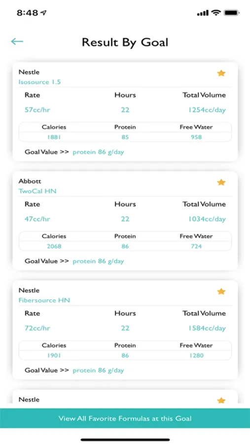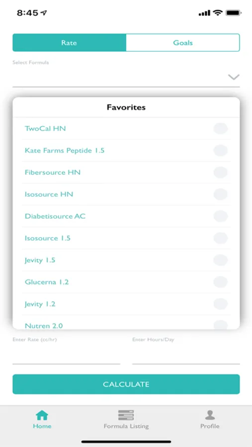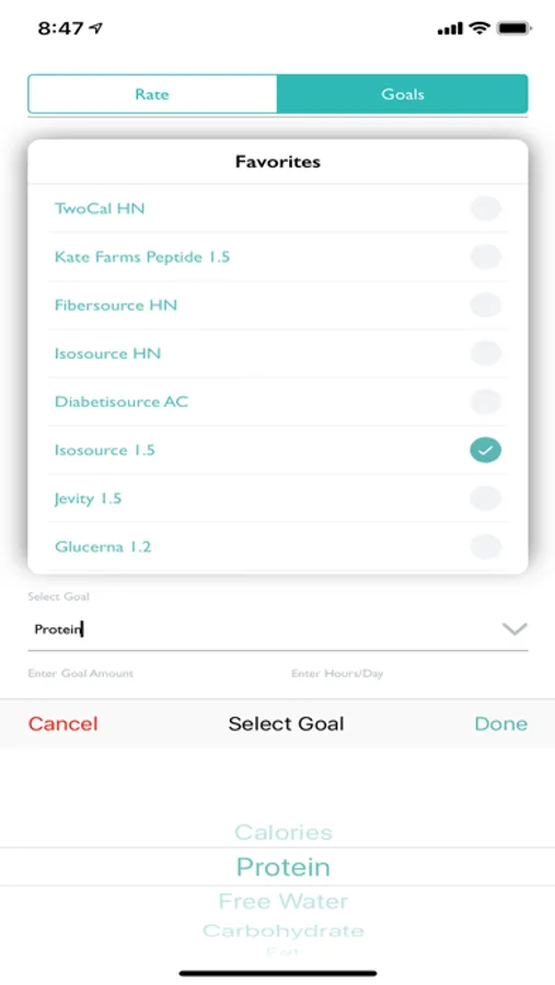 You can also select a criterion and enter a goal. The options are calories/day, protein per day, free water/day, carbohydrates/day, and fat/day. Select the formula and number of hours per day the formula will be given. The app will then calculate the rate needed to meet that goal.