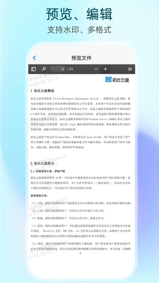 统一权限控制,通过服务器端设置多项权限,控制用户端的预览、删除、下载、重命名等功能。