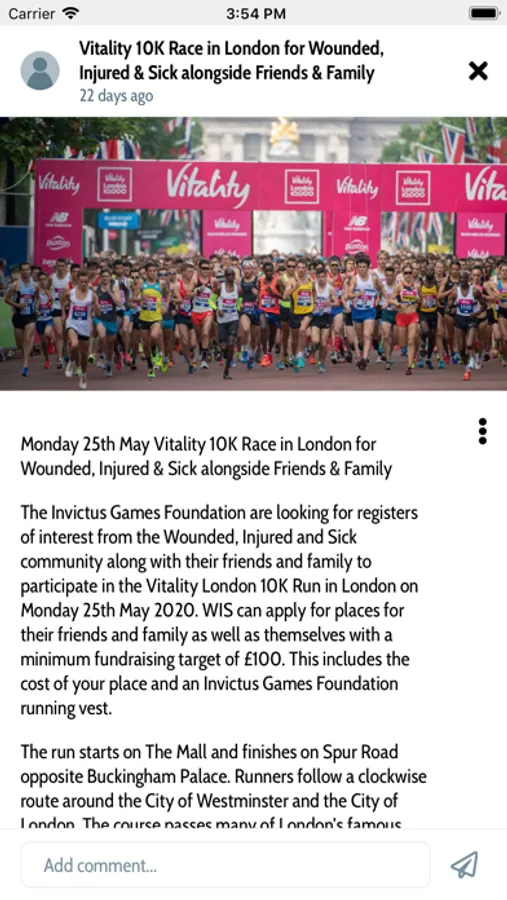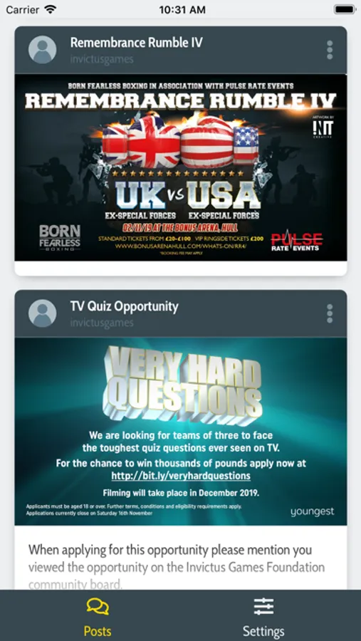 Online Community for international wounded, injured or sick Servicemen and women, serving or veteran. Developed and managed by the Invictus Games Foundation. The Invictus Games Foundation (IGF) Wounded, Injured and Sick (WIS) Community noticeboard and app is for those who have been injured or fallen ill during or as a direct consequence of service. This platform allows WIS to access various opportunities shared by the Foundation in order to support their recovery journey. In addition, this platform also allows for communication between members of the international WIS community to discuss relevant opportunities, share knowledge and support each other during and post-recovery.
