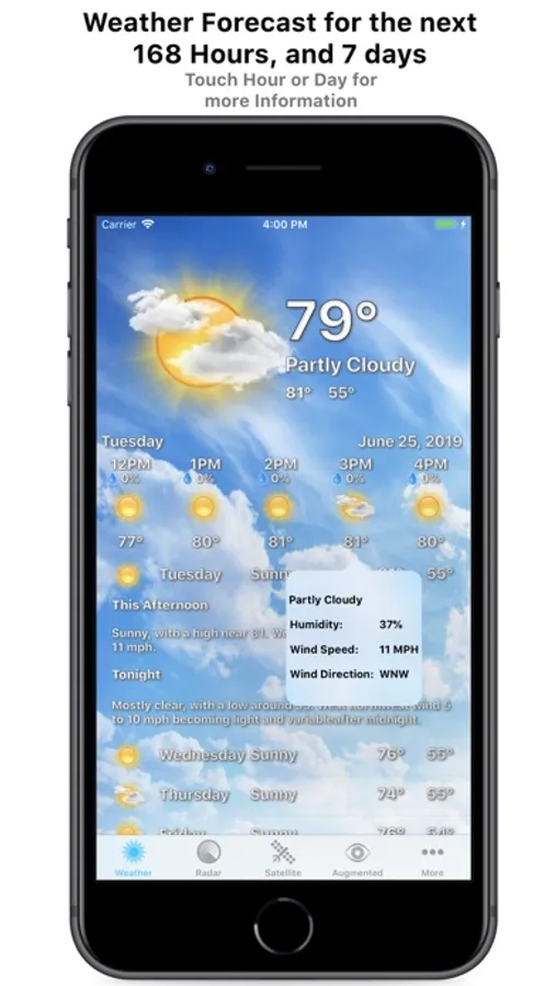 Introducing Radar AR: The most beautiful and accurate Doppler Radar and Weather app, that also shows you Weather conditions around you in Augmented Reality. Simply hold your Device up in the direction of a City or Tropical Cyclone, to see what Weather conditions are like in that area! In addition to our groundbreaking Augmented Reality feature, Radar AR includes a full Local Weather Forecast, Interactive Radar, Full color Satellites, Local Radar, Regional Radar, and more! Local Weather includes Current Weather, a 7 Day Forecast, and an Hour-by-Hour forecast for an unheard-of 168 Hours. If you want to view more information for a Day or Hour, simply Touch it and additional data is unobtrusively displayed. And with our Interactive Radar feature, viewing Animated Precipitation, Earthquakes, and even Tropical Cyclones is literally a breeze.
