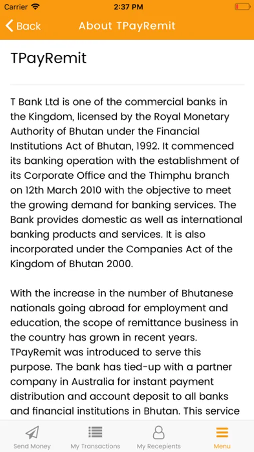 T Bank has embarked into simple, fast and reliable Mobile App for sending money from Australia to Bhutan. It is secured and convenient. You can send money for Cash Pick-up and Bank Deposit with T Bank and any other banks in Bhutan.