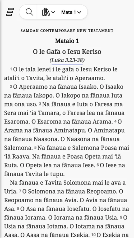 This Samoan Bible is a simple Bible in your pocket. We’ve intentionally made the application simple to have focus on God’s word without distractions. The interface to browse and search the Bible is easy to use with the added benefit of offline reading when the internet is not assessable.