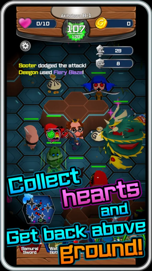 In this game there is no need to hurry. The game is turn based. After you take a turn, the monsters will take a turn. By collecting all the hearts on a level, you are able to move up to the next level. You don't necessarily need to defeat all the monsters to clear a level. It's important to be able to understand each monster, and predict what they will do next. Sometimes you will come across items as you move through the stages. There are many powerful offensive and defensive items, so make sure to put them to good use on your adventure.