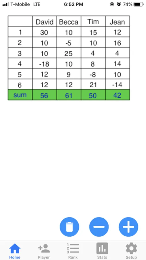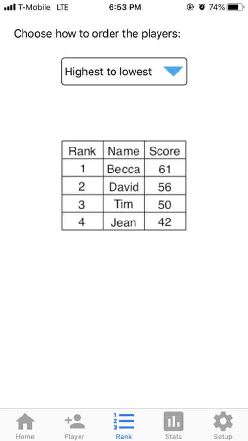 Add as many players as you would like to the game. Keep track of each player's score over multiple rounds. Edit scores from previous rounds. Visualize players' ranking, and even view a graph of your score over time!