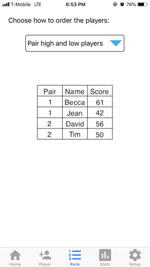 One special feature for you Nertz players out there (that play in teams): this app will automatically tell you which players should pair up by using the "Pair high and low players" option on the ranking page!