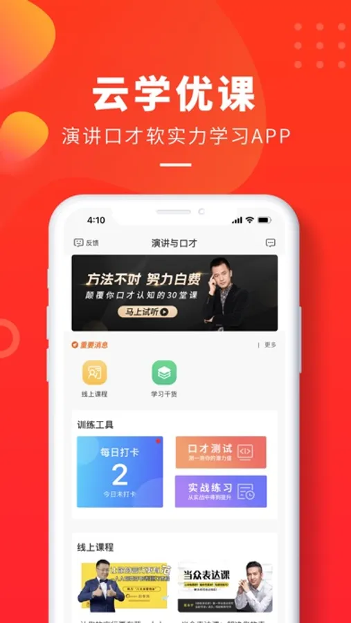 云学优课是一款演讲口才在线学习的平台。里面既有线上公开课,又有线下机构课程推荐,同时满足用户多维度的学习需求。