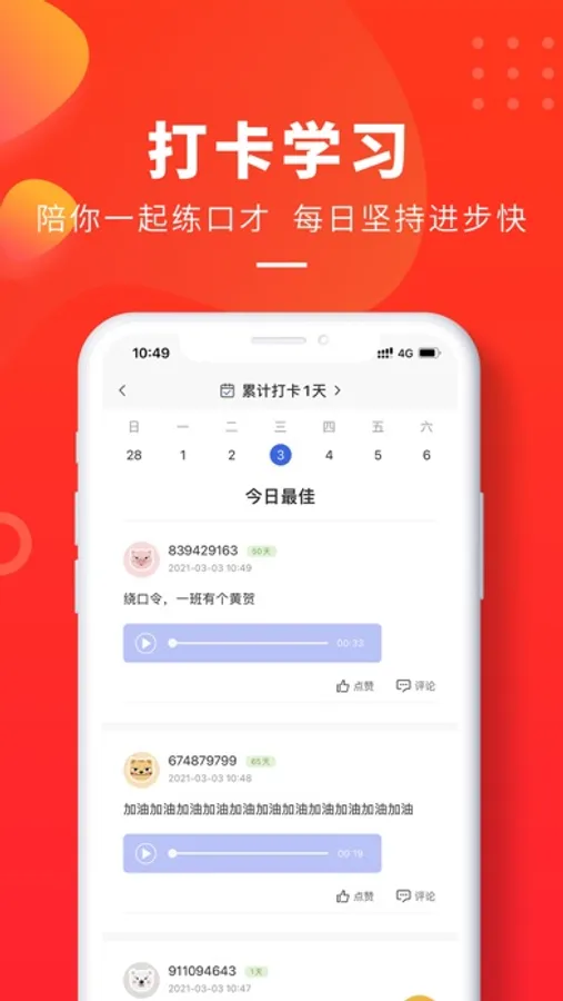 在APP里进行“每日打卡”,科学体系训练让你普通话、语感、发音能力更上一层楼!