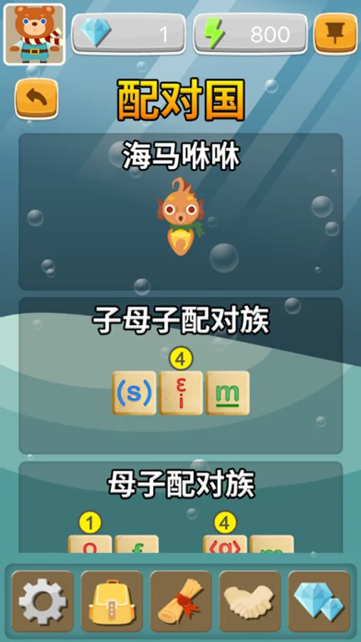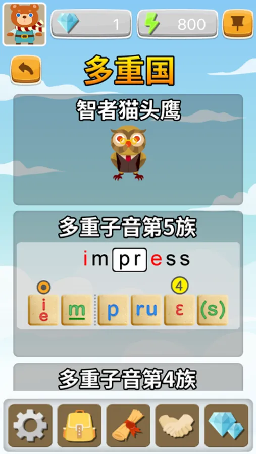 拼音熊游戏共有三个国度,前兩个国度规划就是先学拼音系统,让学习者先完全掌握美语的拼音 (声音) ,最启一个国度再学拼字规则。