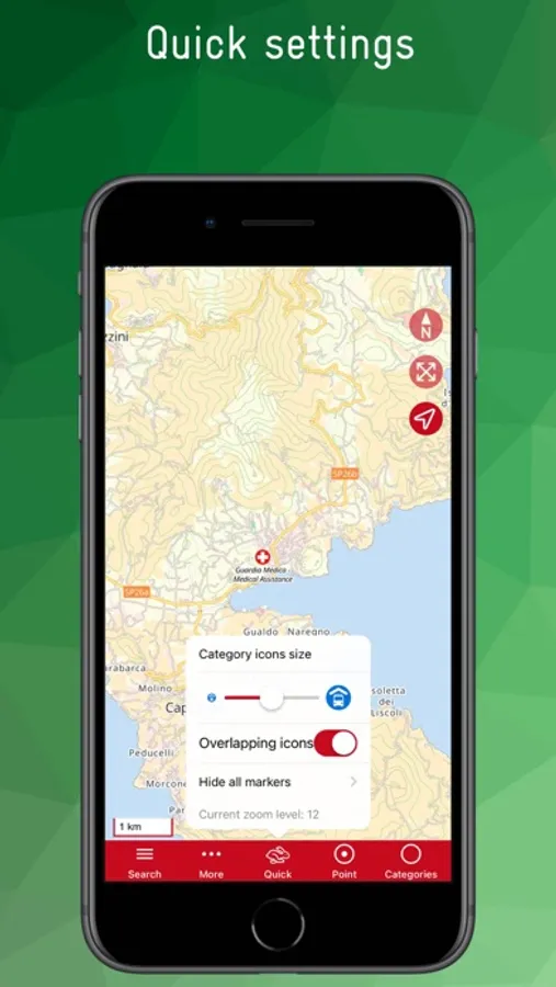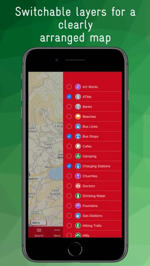 POIs are grouped into categories and can be displayed as layers. For example, you can display all restaurants, public transport lines, banks, hiking trails, charging stations and doctors on the map. The size and overlap of the icons can be adjusted to improve clarity.