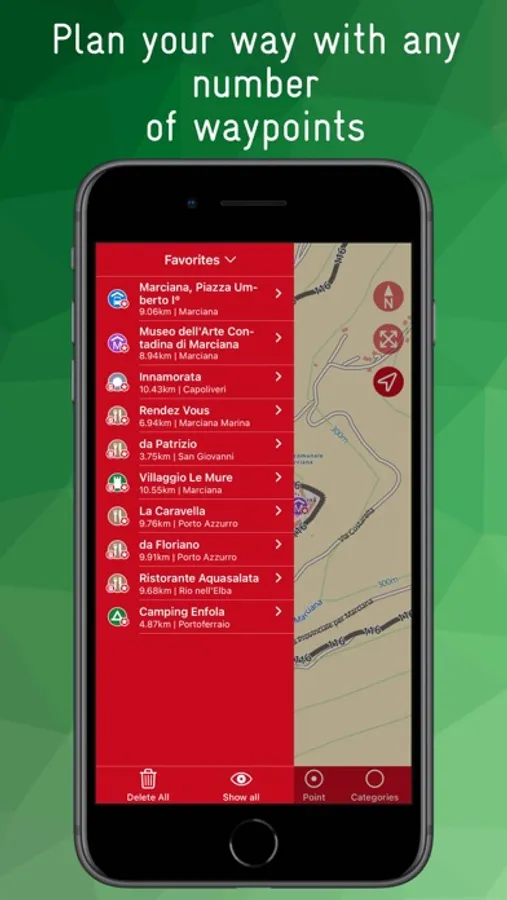 An integrated database allows you to search for POIs as well as a large number of streets, towns, villages, districts, etc. The search can be filtered by category and/or distance.