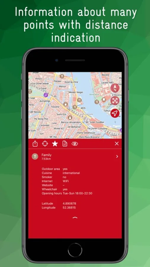 For many POIs there is further information such as opening hours, address, disabled access, ... Notes or favourites can be created for each POI, a history list shows the most recently used POIs, content can be shared.