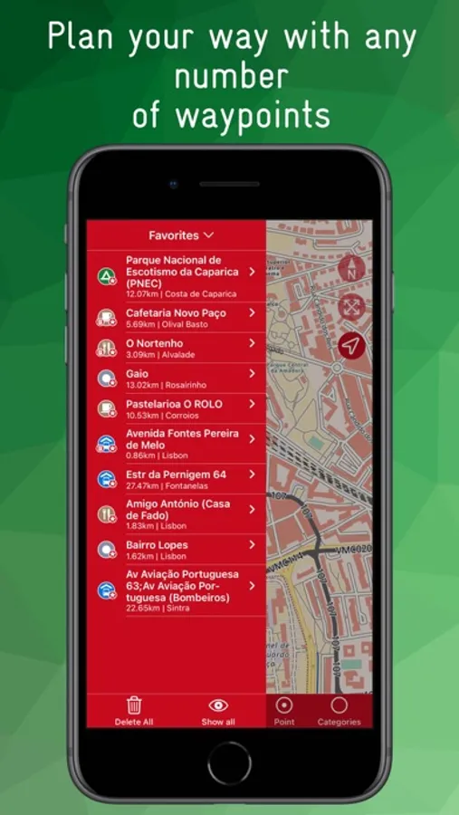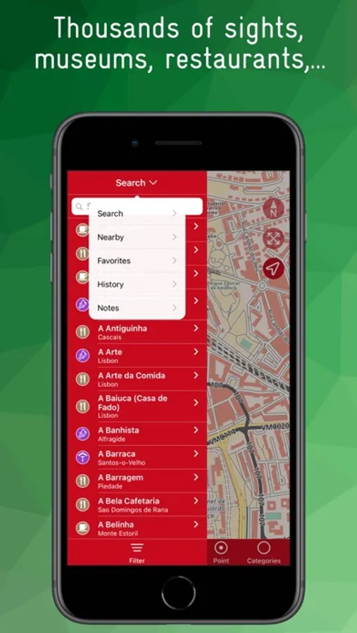 An integrated database allows you to search for POIs as well as a large number of streets, towns, villages, districts, etc. The search can be filtered by category and/or distance.