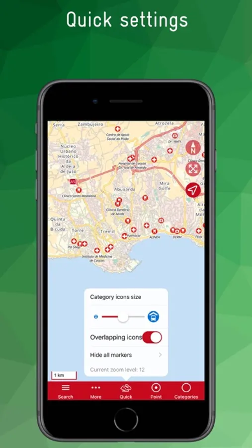 POIs are grouped into categories and can be displayed as layers. For example, you can display all restaurants, public transport lines, banks, hiking trails, charging stations and doctors on the map. The size and overlap of the icons can be adjusted to improve clarity.