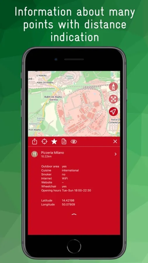 For many POIs there is further information such as opening hours, address, disabled access, ... Notes or favourites can be created for each POI, a history list shows the most recently used POIs, content can be shared.