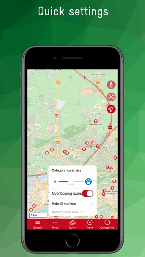 POIs are grouped into categories and can be displayed as layers. For example, you can display all restaurants, public transport lines, banks, hiking trails, charging stations and doctors on the map. The size and overlap of the icons can be adjusted to improve clarity.