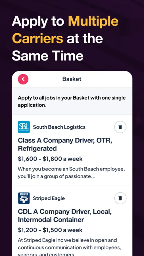 Enjoy the fast-track to orientation. Create a driver profile and it’ll be used as an application for any carrier you choose to apply to. Your profile contains all the verified information a carrier needs to take you to the next step so you won’t need to waste time fumbling with applications.