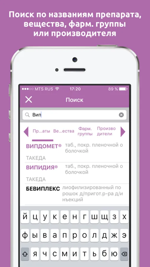 Возможность искать препараты, используемые в эндокринологии, по фармакологическим группам, активным веществам и производителям.