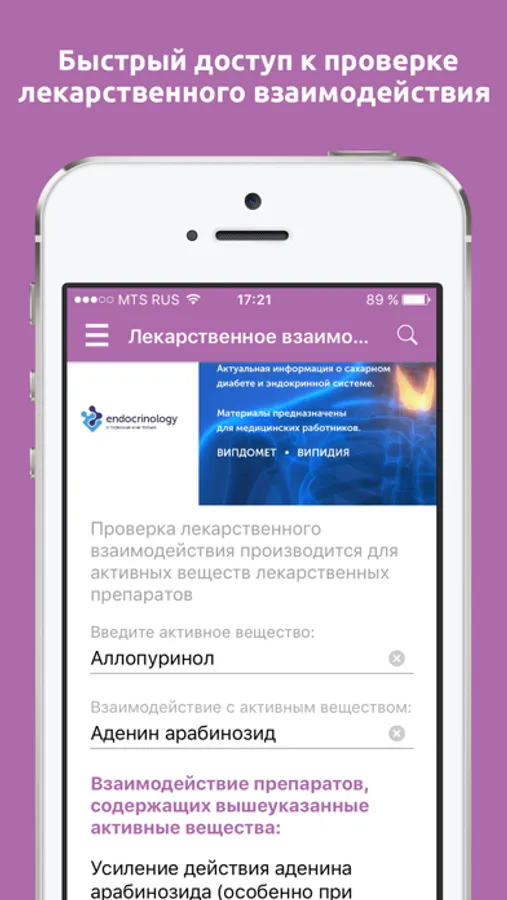 Интерактивный справочник Видаль содержит описания препаратов, применяемых в эндокринологии. Удобный поиск лекарственных средств, медицинские новости, мобильная помощь в профилактике и лечении эндокринных заболеваний.