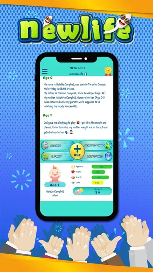 NewLife game is a text choices simulation gaming app rating for users 15 years and older. You start off NewLife in a random character at birth with a pair of parents tasked with raising you and then allows you to make text-based choices that will impact how the life of your character you are playing turns out from birth until death.