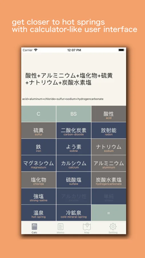 Enter the button names "酸性", "硫黄", "アルミニウム" ... in the order of the spring quality name, and tap "=" at the end.