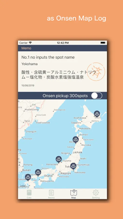 "OnsenCalc." is an app that has the function to enjoy the Onsen you visit more, using the "spring quality" written in the onsen analysis table.
