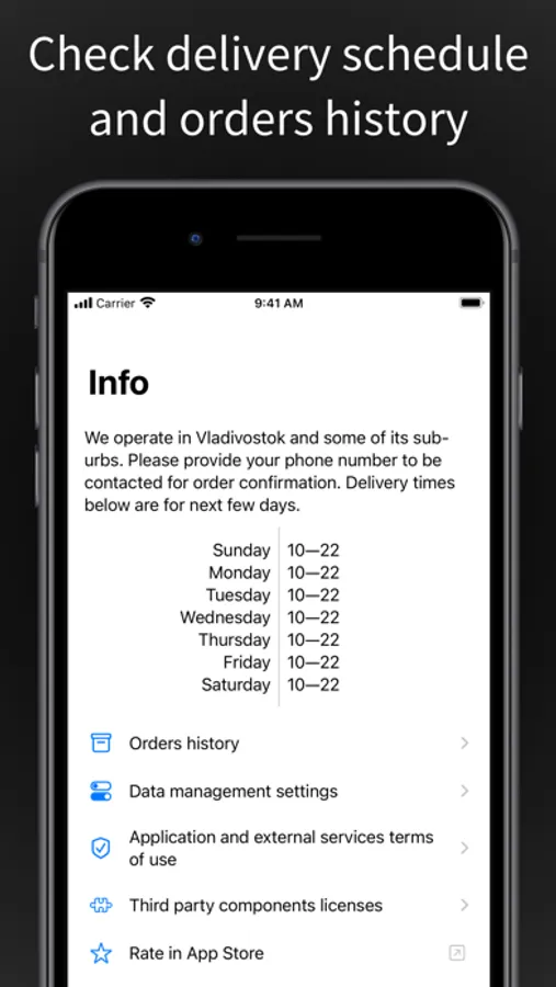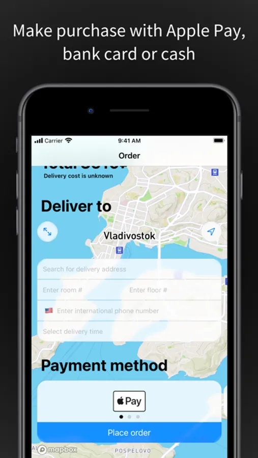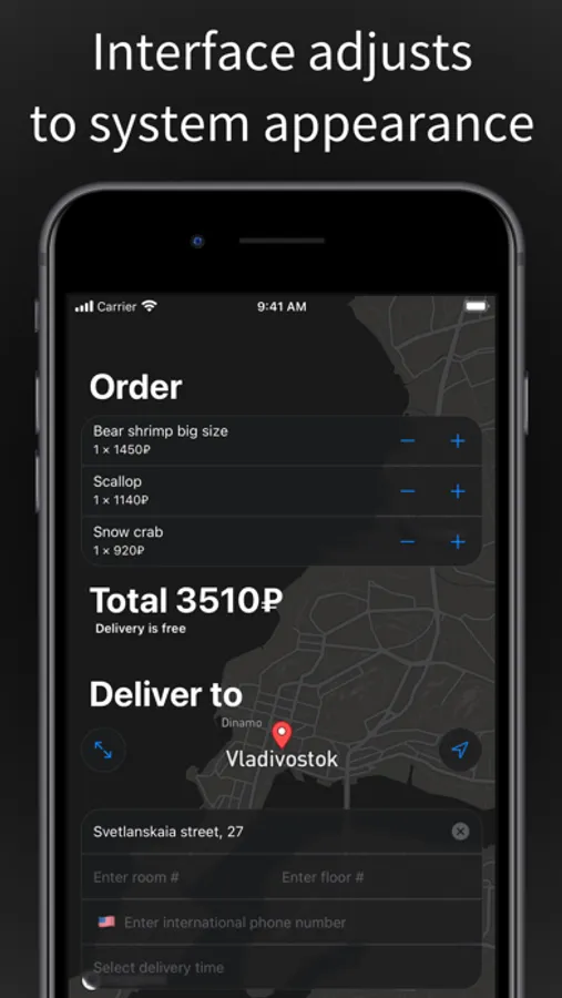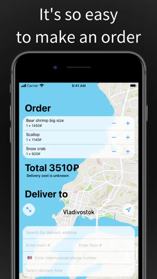 Crab.delivery is an online store. It is easy to place an order even if you can't speak Russian. Just provide your phone number and point the address on map or search for address in English.