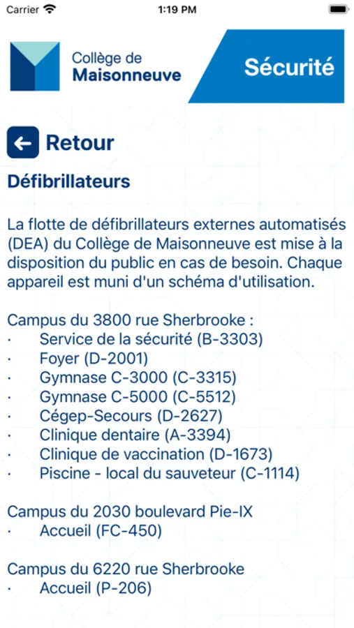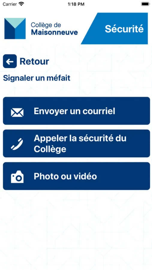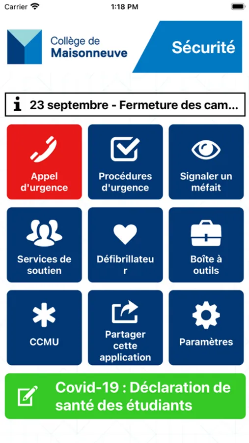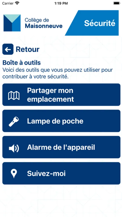 Sécurité Maisonneuve permet d’être alerté rapidement ou de prévenir les services de sécurité d’une situation d’urgence à Collège de Maisonneuve. Les fonctionnalités comprennent un accès facile à des ressources de soutien, des notifications d’urgence, une boîte à outils, et plus encore.