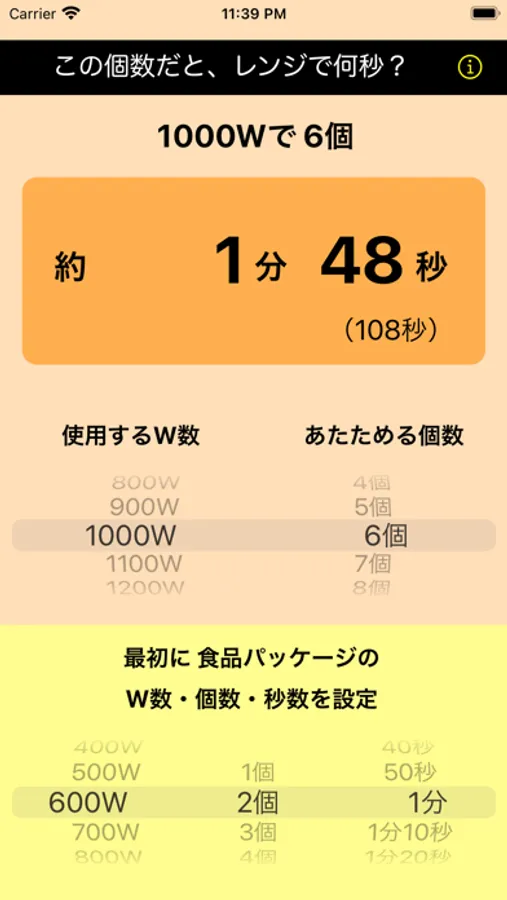 冷凍食品をレンジで解凍する時などに、パッケージに書いてあるW数・個数でない場合、何秒であたためるかを計算します。