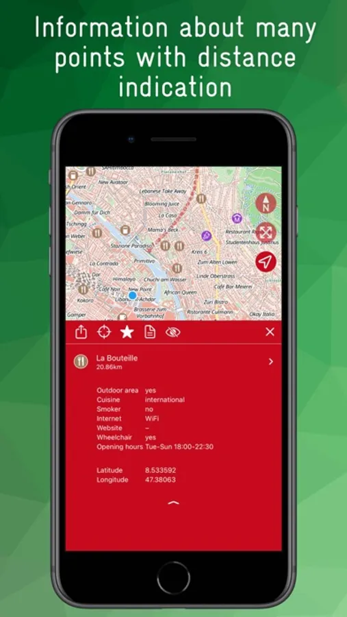 For many POIs there is further information such as opening hours, address, disabled access, ... Notes or favourites can be created for each POI, a history list shows the most recently used POIs, content can be shared.